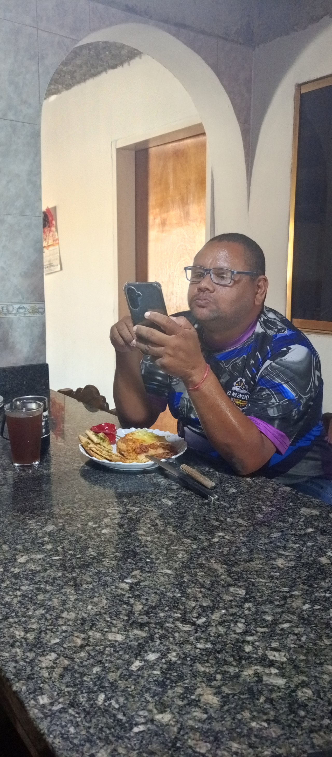 Disfrutando de su rica lasaña, leyendo mensajes en el teléfono , y viendo tiktok, e instagram, eso es lo de el je,je,je ,je,je.