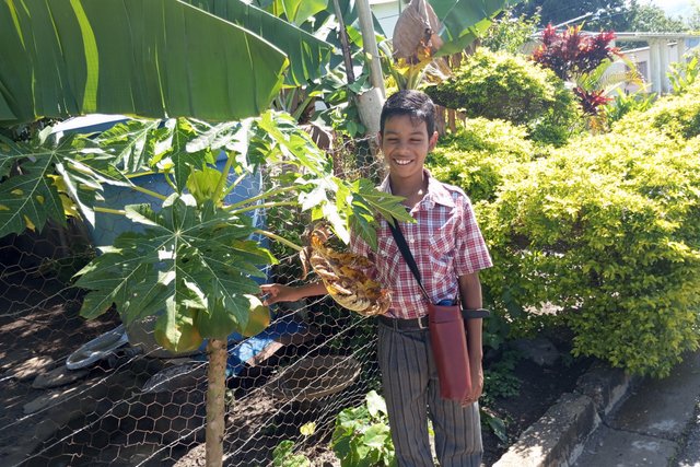 Al salir de casa en esta oportunidad, tomamos el transporte muy rápido, y pudimos llegar a nuestro destino. Enseguida mi hijo observó una planta de lechosa pequeña muy cargada y esa fue nuestra primera fotografía del día. Y como pueden observar, la cantidad de plantas que hay en ese espacio son muchas, lo que hace del ambiente fresco y agradable.