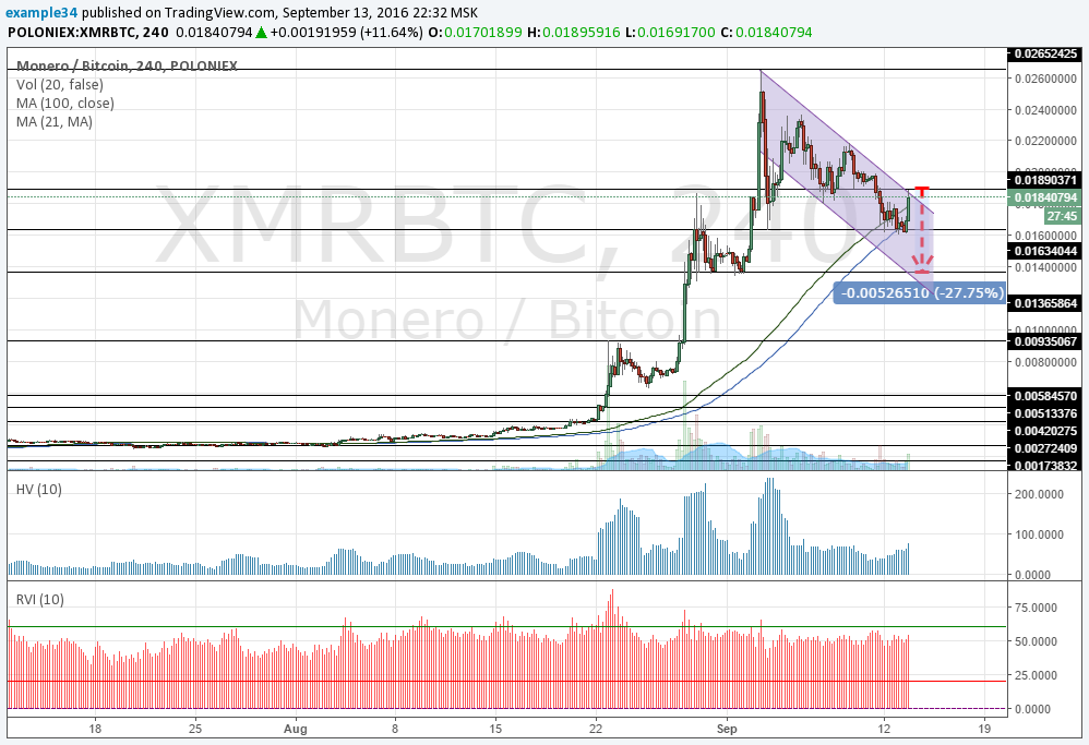 Finally, Monera reached it`s high - 0.02652 and we are in the correction zone. A further reduction in price will continue. The level of the strong support is 0.01634 from which the price rebounded. As long as the quotes are moving in the channel, the nearest aim is 0.01365.