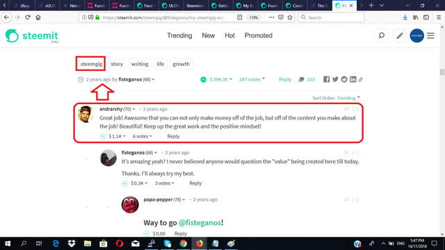 Aquí hay un viejo comentario de @andrarchy (hecho hace unos 2 años), donde reaccionó ante la belleza potencial de SteemGigs :