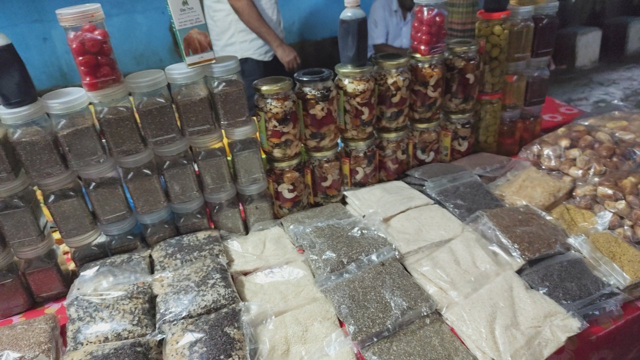 Especially, every thing is available absolutely pure. Different types of spices are available here. Which we use in different types of things. Again, good quality pickles are also available here. With which we make many things. These are of good quality, now they are very good for the body. Like eating ashar increases the digestive power of our body. Similarly, different types of nuts are available here. The nuts are of good quality. And there are numerous national things here. Which are small items but still they are very popular with people. Let's see some spices are kept in a small pot. And the price of these spices is very high. And people come from far and wide to buy good quality spices.