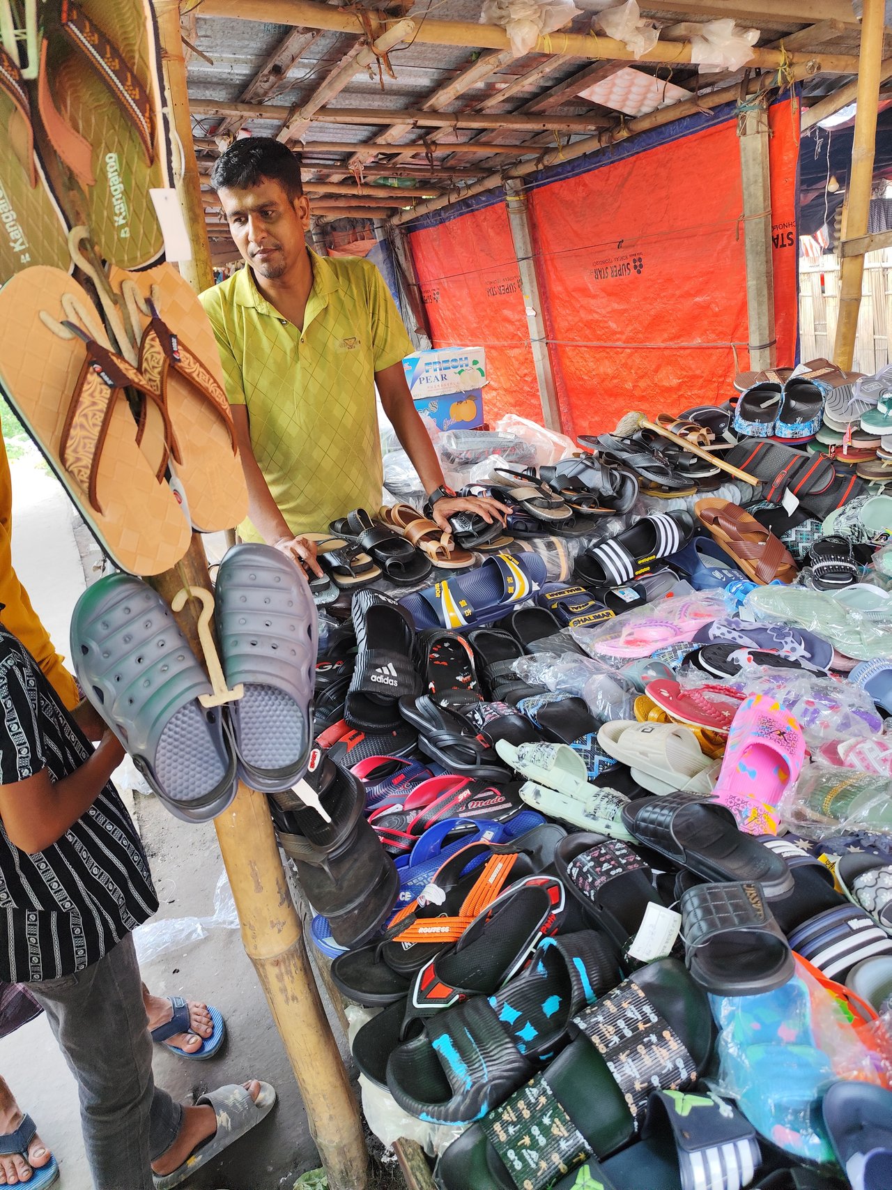 This shopkeeper's name is Mamun. Mamun is my cousin. He sells shoes in the open space in the middle of the market in Kazirhat. And he goes to Feni town, collects the shoes and sells them in Kazirhat. And good quality shoes are sold here. He sells good quality shoes for women, men and small children. I have bought shoes from this shop several times for my family. I bought shoes here for myself. But the shoes are so good that they can be used for a long time. And the shoe shop always has a lot of customers in winter, summer and monsoon.
