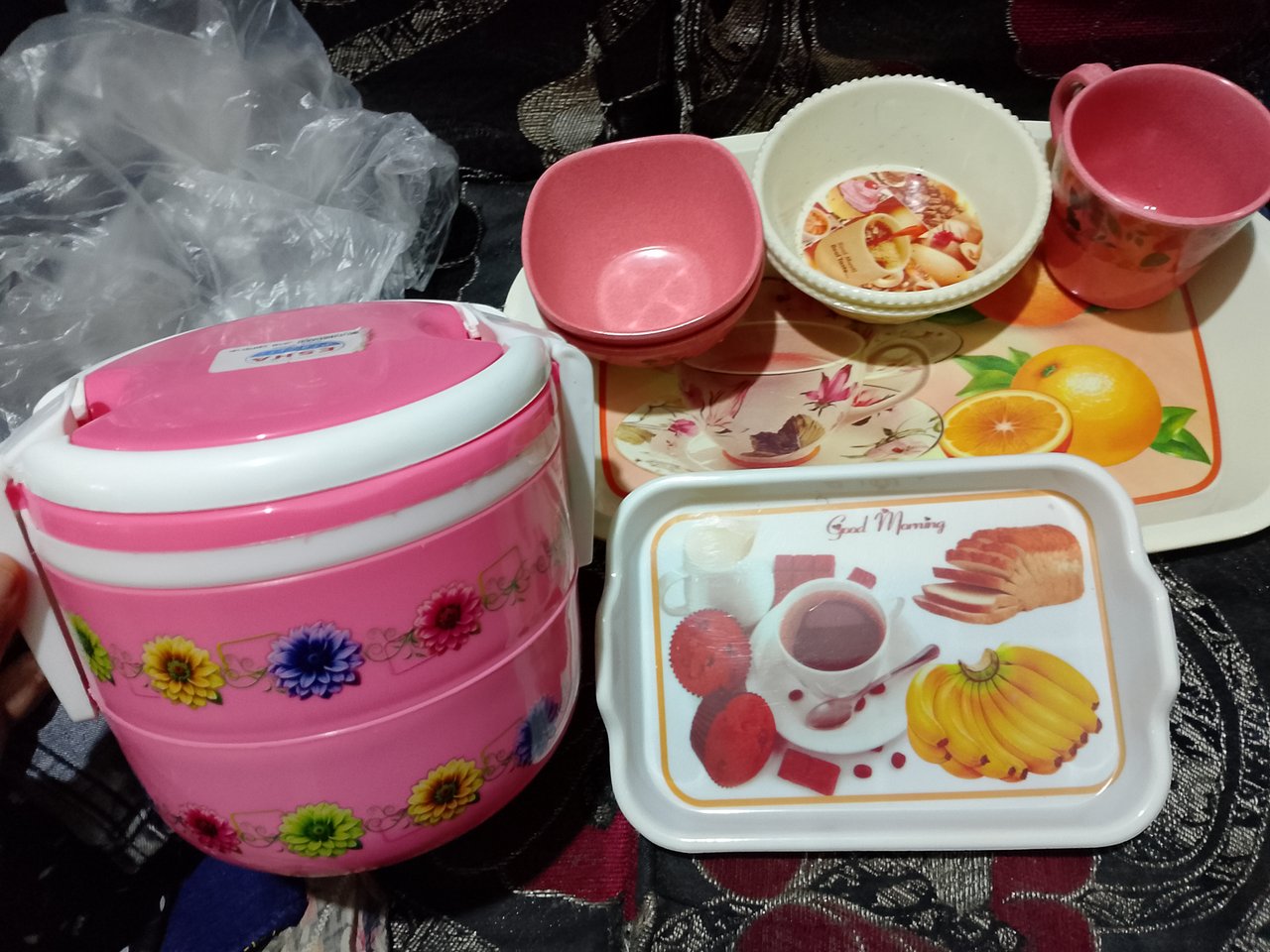 Yes, today I have brought many things. .Today, I have brought a tiffin box, two small bowls, two trays, and a coffee glass. Below, I am sharing their pictures, prices, and a video.