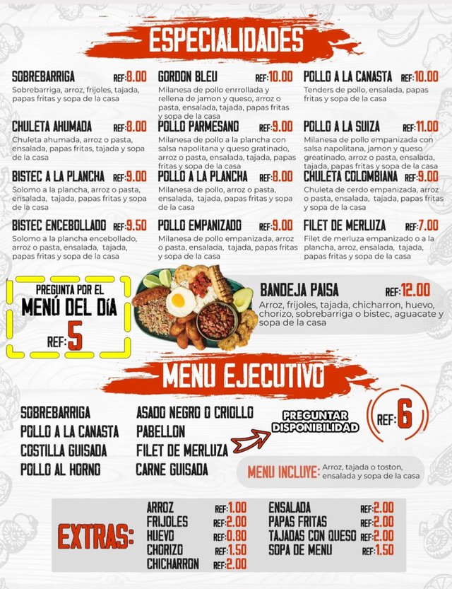 Con respecto al menú, para los desayunos ofrecen: empanadas, papas rellenas, tequeños, fritos de yuca, pan de bono, pan de mantequilla, panes rellenos de jamón y queso, también cachitos y pan de jamón.