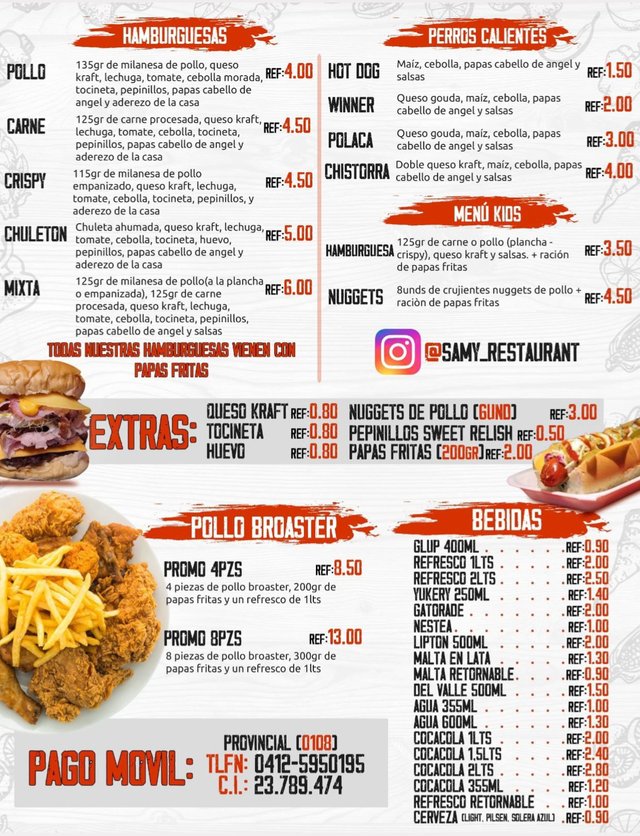 En Samy los precios son muy económicos, además de ofrecer gran variedad de combos en sus productos que se hacen mucho más accesibles. Además aceptan todo tipo de pagos vigentes en Venezuela.