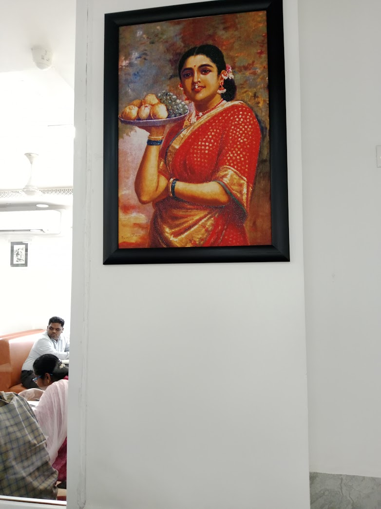 It was very crowded when we went. It was lunch time and it was very crowded. We couldn't find a seat. The restaurant supervisor took our name and told us to wait for a while. I took pictures of the interior there. There were a lot of paintings, especially Ravi Varma's painting. I was very impressed.
