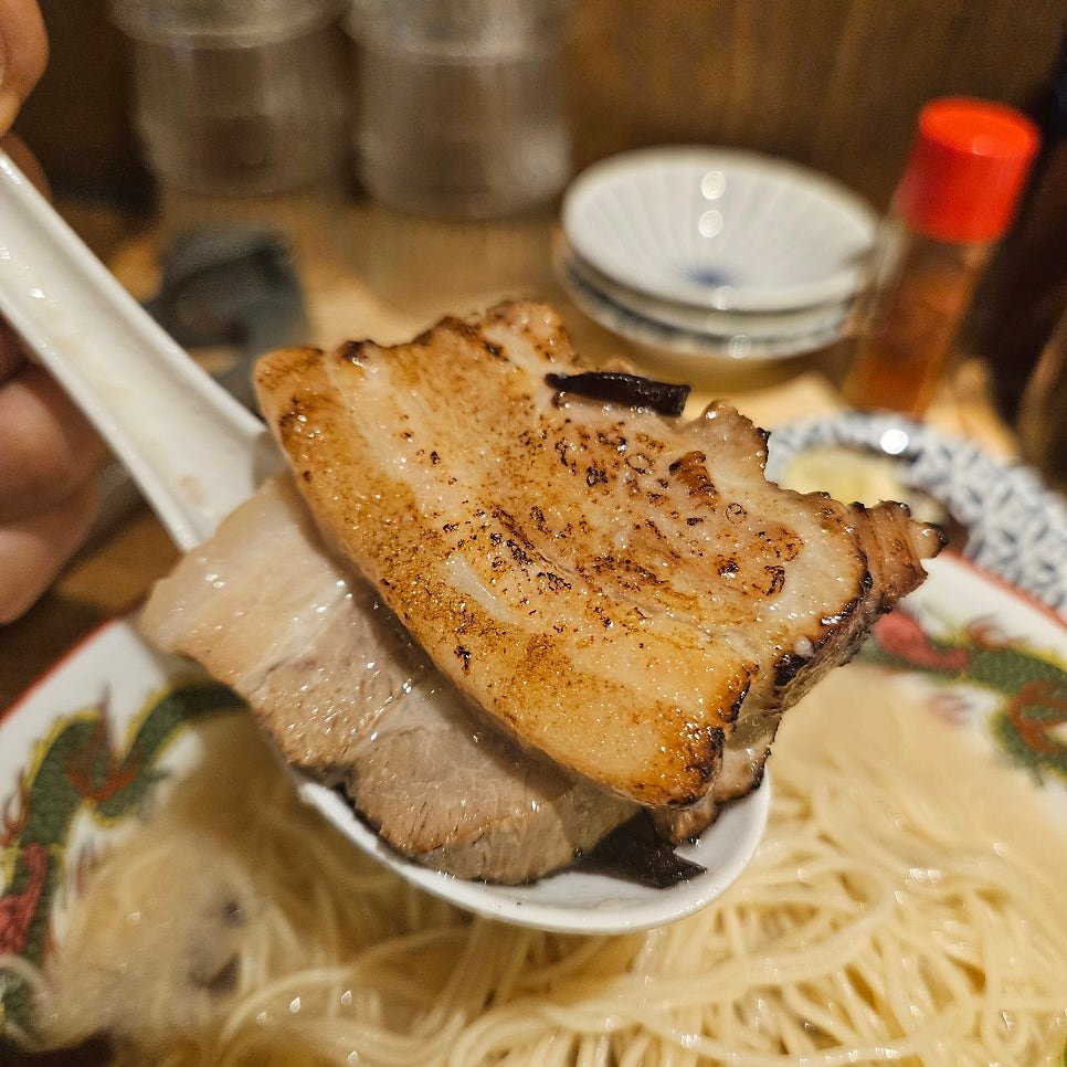 반숙으로 적당히 익은 계란과 잘 익은 면의 식감이 상당히 좋다. 큼지막하게 들어있는 차슈는 파를 곁들여서 먹으면 부드러우면서도 시원깔끔한 맛을 느낄수 있다.