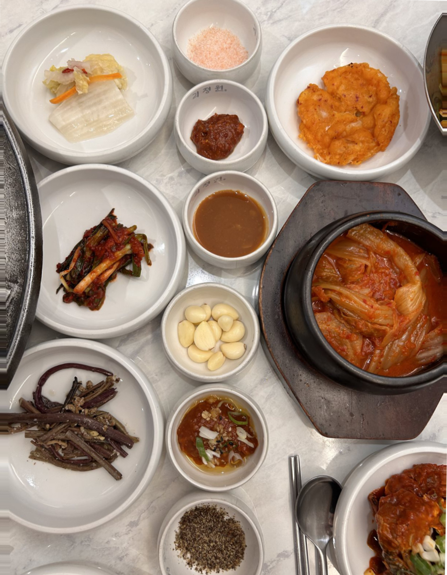 내부가 넓고 깨끗하다. 사람들이 많아서 홀을 자세히 찍지는 못했고 우리가 앉은 테이블에서 옆쪽으로 한컷 찍었다. 주문을 하고 반찬들이 나오고 세팅이 되는데, 찬들이 정갈하고 하나같이 맛이 좋았다.