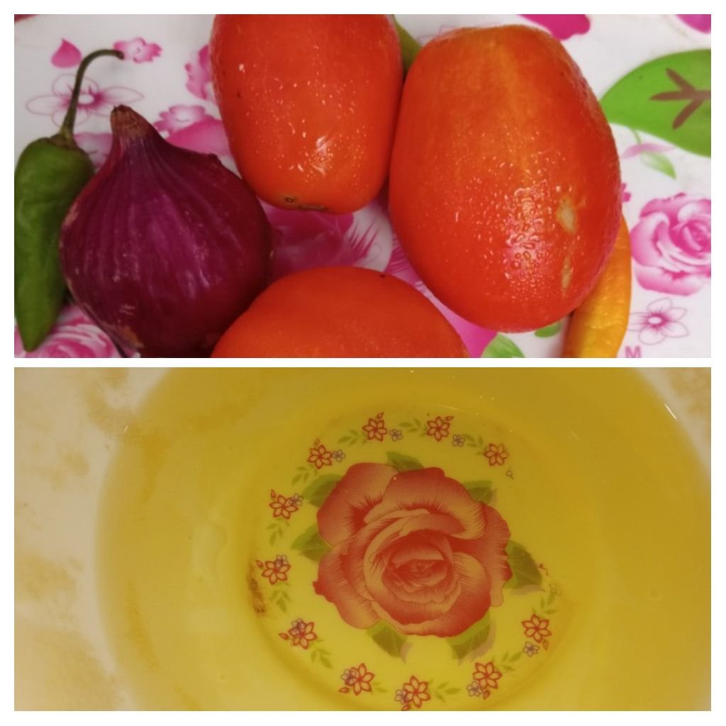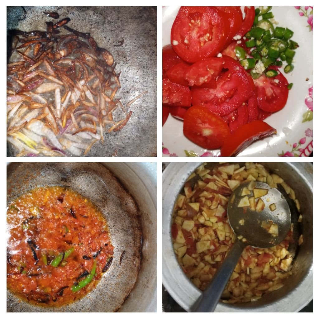 Then I Cook the tomatoes and mirches .