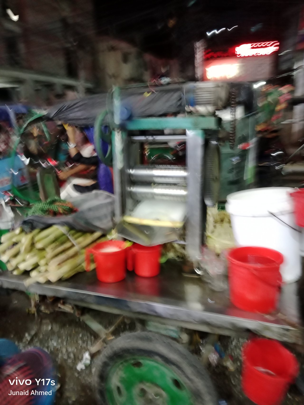 This is a sugarcane juice machine. Sugarcane is cut and fed on one side and its peel comes out on the other side, and there is a tube with it, through the tube the sugarcane juice comes out. The price per glass is 30 to 40 taka. Sugarcane juice reduces body heat, calms the mind, and gives instant energy.