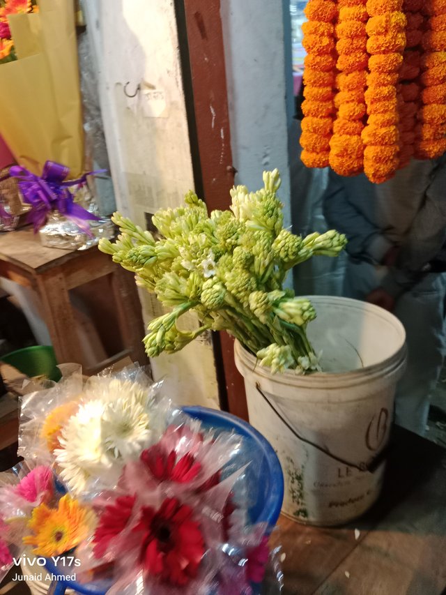 This picture was taken from a flower shop. Flower shops are crowded almost all year round, weddings, home decoration, puja festivals, all these events always require flowers. This shop had many varieties of flowers, but I couldn't take a good picture because of the crowd of people. The shops are located on the sidewalk, and everyone uses the sidewalk in the market, so you can't stand for long. Some people push from behind to move forward.