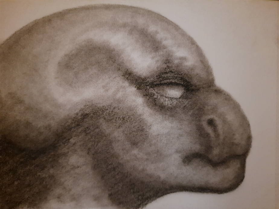 The process for this started with laying down a rough shape with a cotton ball and black pastel chalk, I then use a cotton bud to refine the shapes before using Staedtler Mars black pencils. (4B,8B)