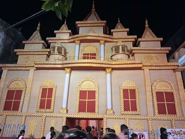 প্যান্ডেলটি রাস্তার ধরেই করা আর প্যান্ডেলের নকশা বেশ সুন্দরভাবে এখানে ফুটিয়ে তুলেছে তারা। এটা দেখেই বোঝা যাচ্ছে, একদম রাজমহলের আদলে তৈরি করা একটা প্যান্ডেল। উপরের দুর্গের মতো ডিজাইন করা এবং সবগুলো স্তম্ভে মন্দিরের দৃশ্য ফুটিয়ে তোলা হয়েছে। এখানে নিচের সমস্ত ফ্রেমগুলো দেখে কাঠের ফ্রেমের মতো মনে হচ্ছে। এখানে জানালার ফ্রেমগুলো একদম একটা বাড়ির বা কোনো মন্দিরের ডিজাইনের সাথে পুরো ফুটিয়ে তোলা হয়েছে। এখানে আসলে বিষয়টা ছোট করে উপস্থাপন করলেও কারুকার্যের মাধ্যমে অনেক কিছু ফুটিয়ে তুলেছে। এইবার প্যান্ডেলের অভ্যন্তরীণ বিষয়গুলো যদি দেখা যায়, তাহলে বিষয়গুলো অনেক সাধারণের মতো ডিজাইন করেছে, কিন্তু সাধারণের মাঝেও সৌন্দর্যটা বেশ ভালো প্রকাশ পেয়েছে।