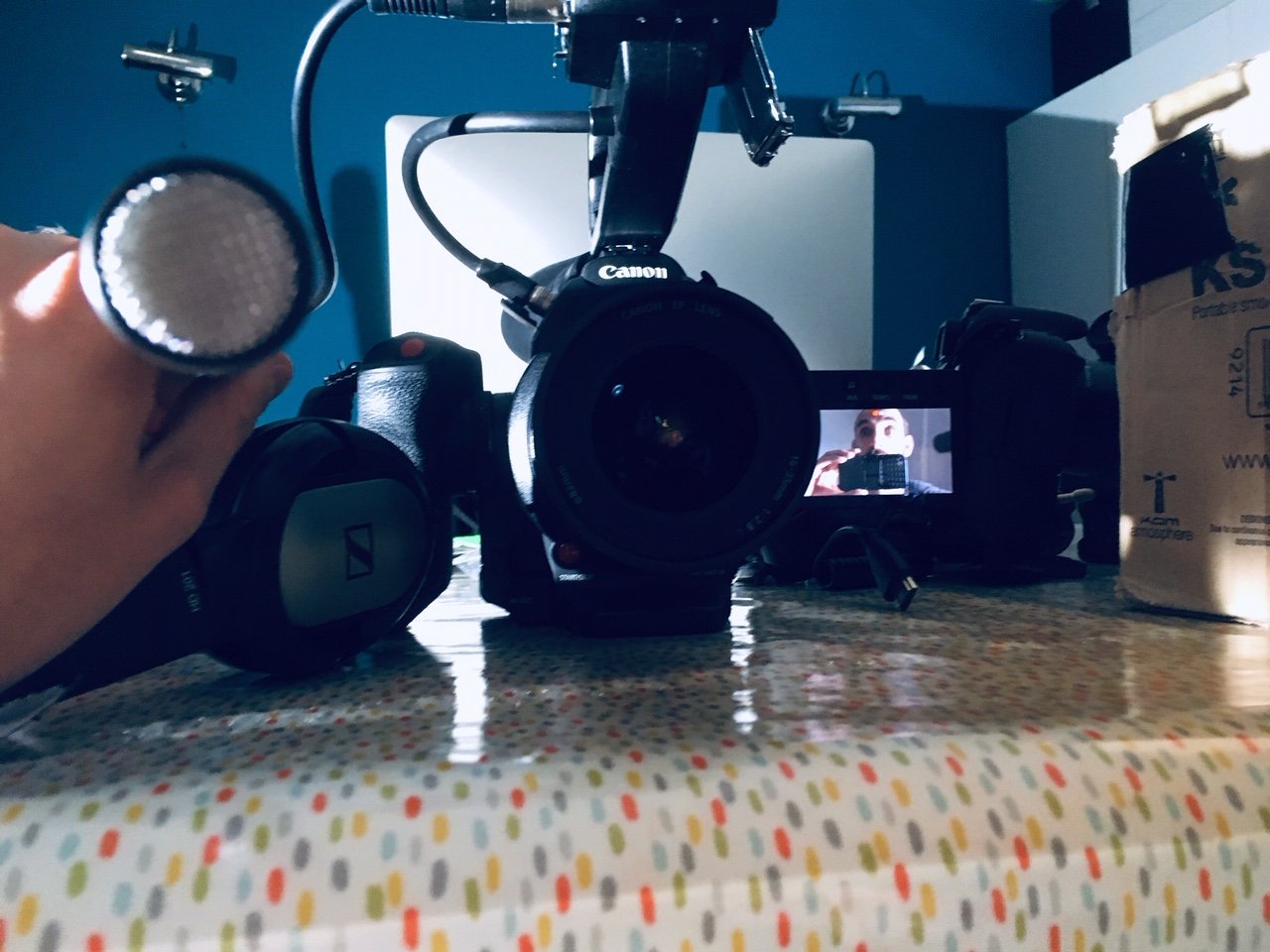 Again this was shot against the existing backdrop setup from the cameras, but I had to re-shuffle to make way from the correct field of view, focus, and make sure the mic was in position. Here's my point of view from when I was talking away :)
