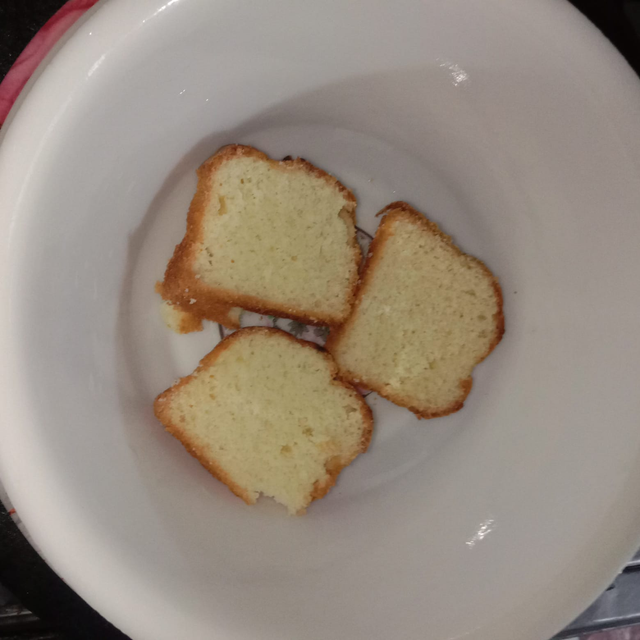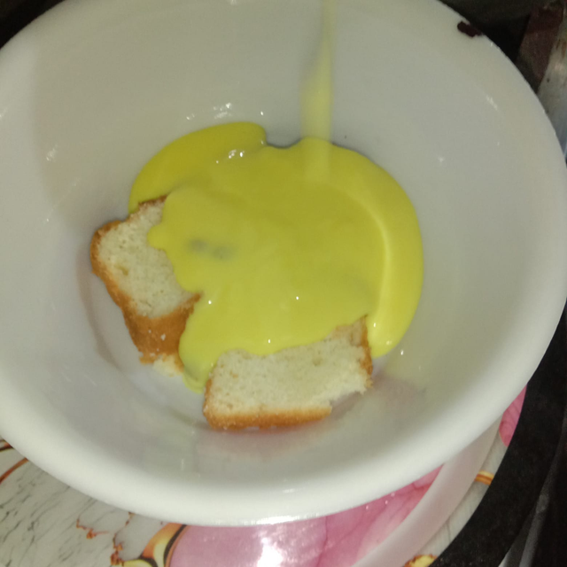 Now our custard has cooled down. Now we need to take a container. First, we will make a bed of fruit cake under this container. After making the bed, we will put the custard inside it. First, we will place the cake in one lay, er and then we will put the custard in the second layer.