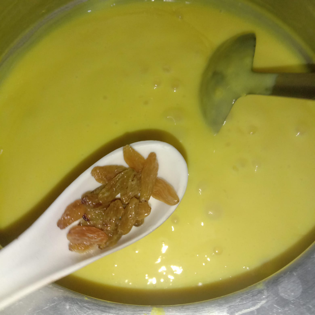 When the milk is boiled thoroughly, the sugar will be mixed in it. Then, add the custard powder paste we have made to the milk and mix it well. Meanwhile, we have to add a few raisins and mix them in with it.