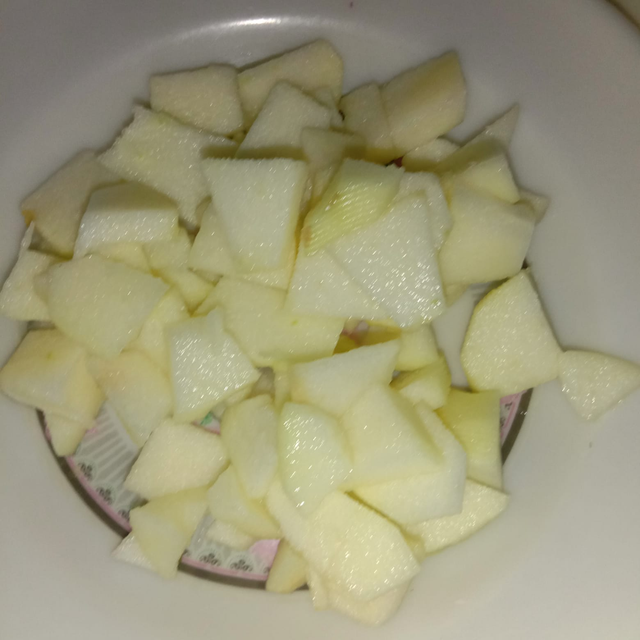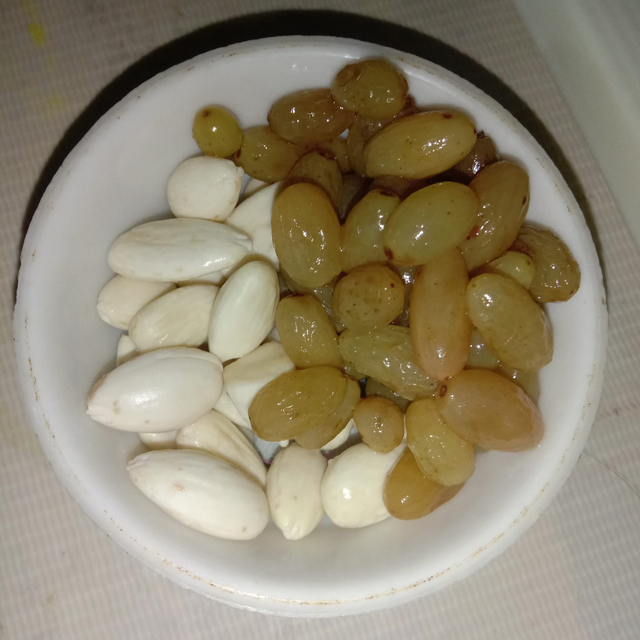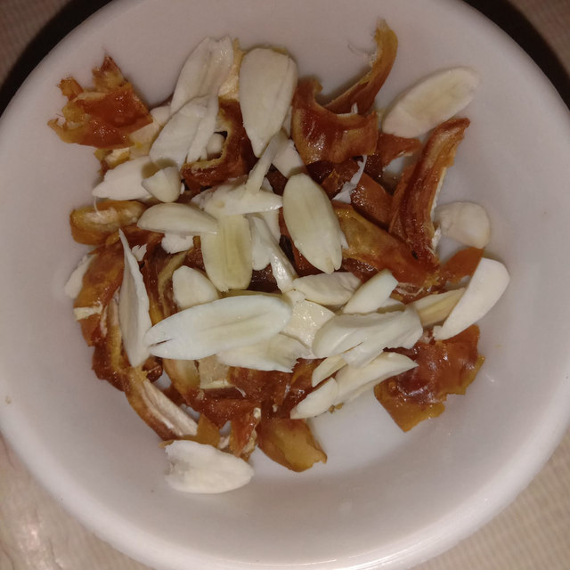 Now we have to cut the fruit we want to add into small pieces properly. I have apples, almonds, and dates. I have divided them into small pieces. First, we have to peel the apples. After peeling, we have to divide them into small pieces. We also have to remove the pit from the dates and divide them into long pieces. We also have to finely chop the almonds.