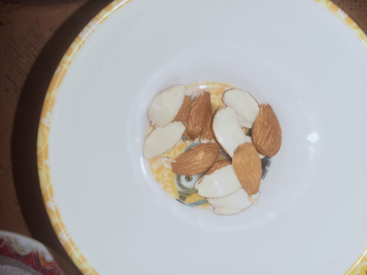 I have taken a steel vessel and put a ghee inside it. I have grind the almonds into two pieces and put them in the vessel. I have tried to make a flower so that when I put the paste inside it and when our cake is ready and we turn it upside down and take it out, our almonds will be visible on the top of the cake. That is why I have tried that. That is why I have put the prepared paste inside it.
