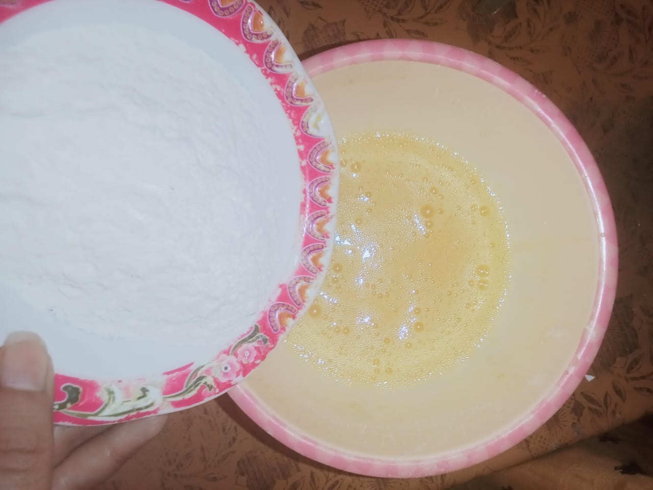 And let me first tell you when I first took the flour and in the second bowl I have broken two eggs and I will beat them well in it. The more we mesh it, the more we will be able to do it right and the more we do it right, then ours will be more delicious and the better all the ingredients will mix.