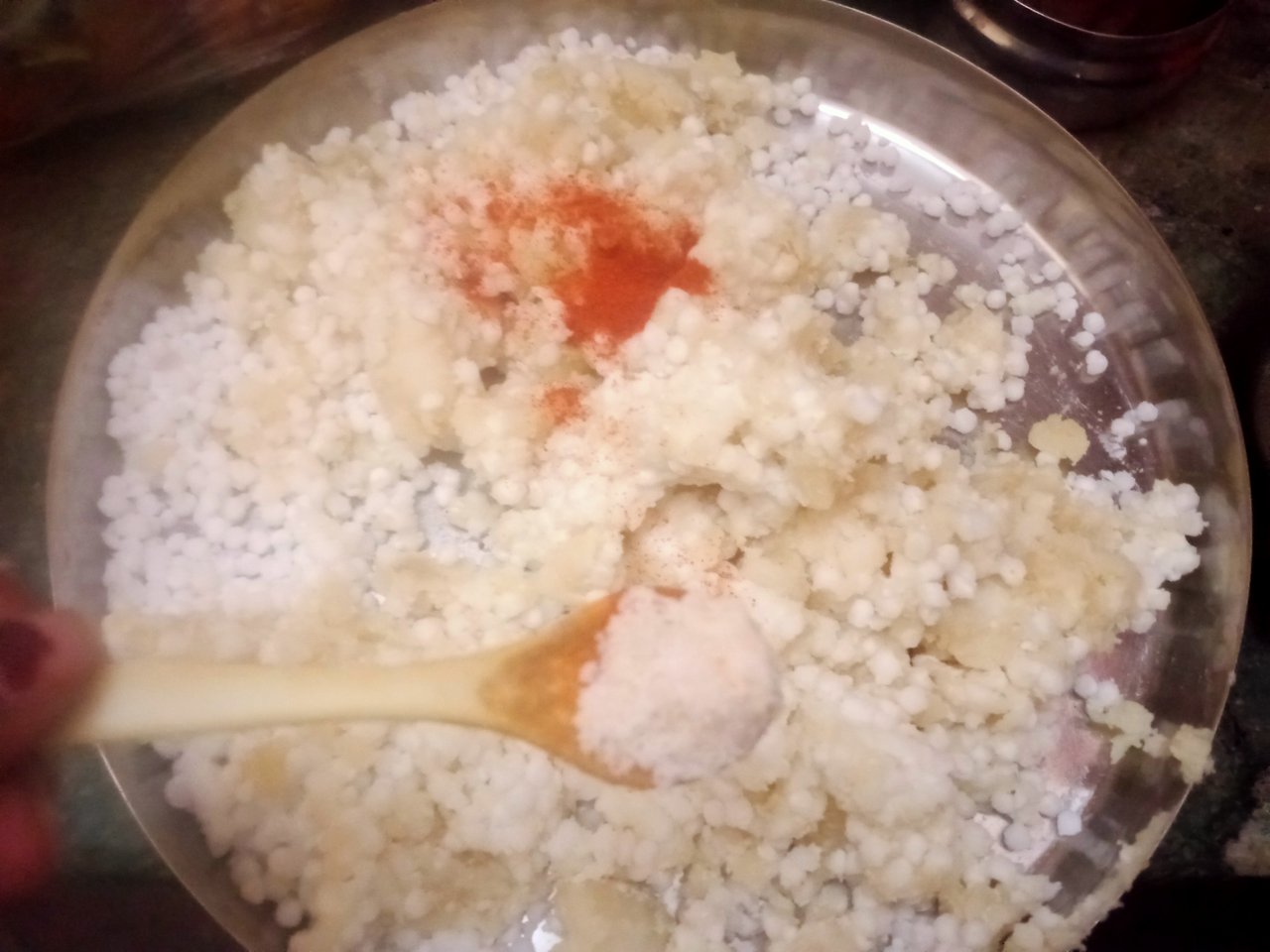 • When the Sabudana has soaked well, it has become soft and all the water has evaporated. Then I poured it into a large container and mixed the peeled and mashed boiled potatoes into it.