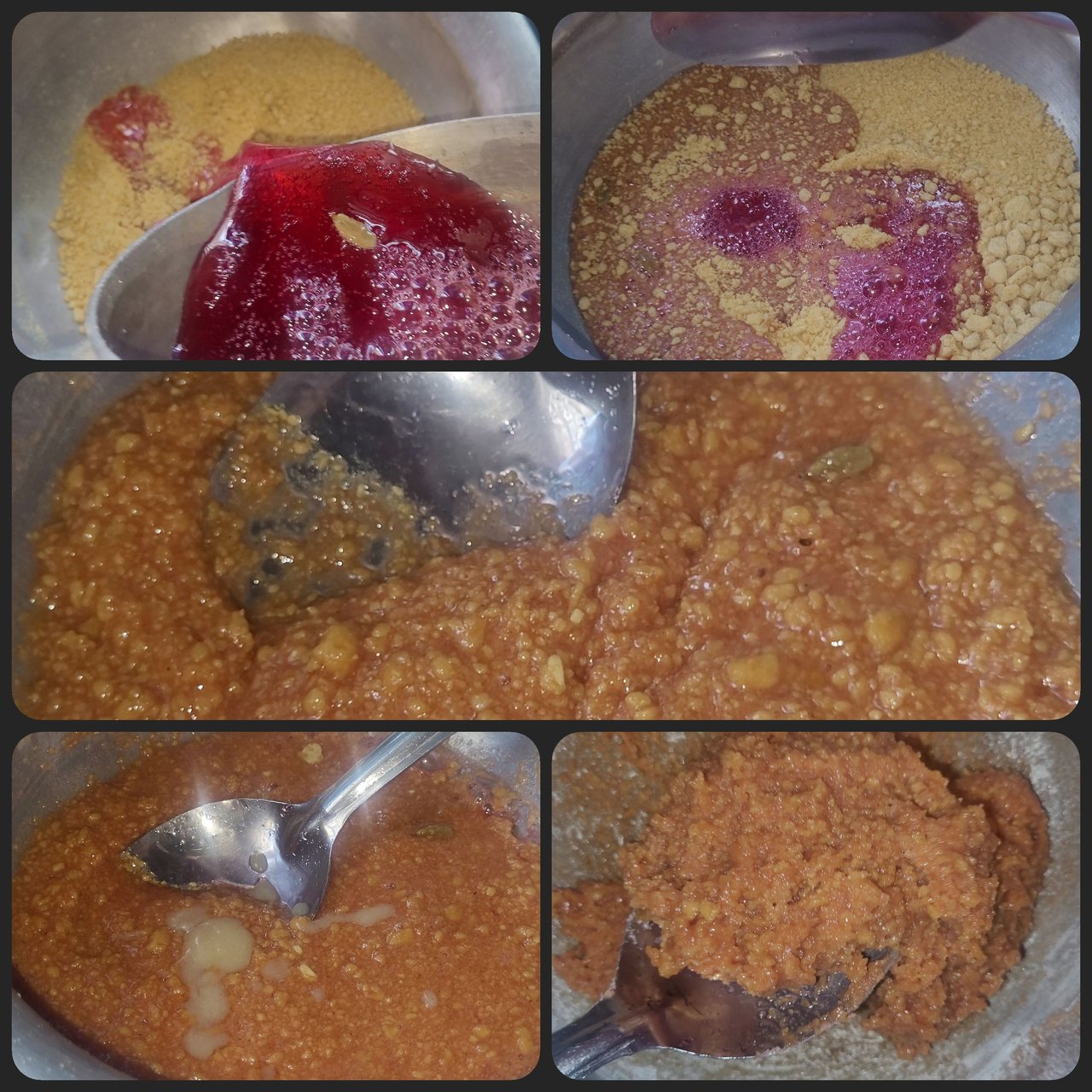 After that, I put the pot of gram flour back on the stove. Then I poured the sticky sugar syrup that I had made into the gram flour and kept mixing it well. It will become very sticky as you stir.I have used a fair amount of ghee in this.