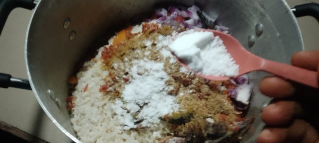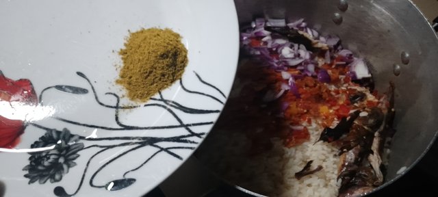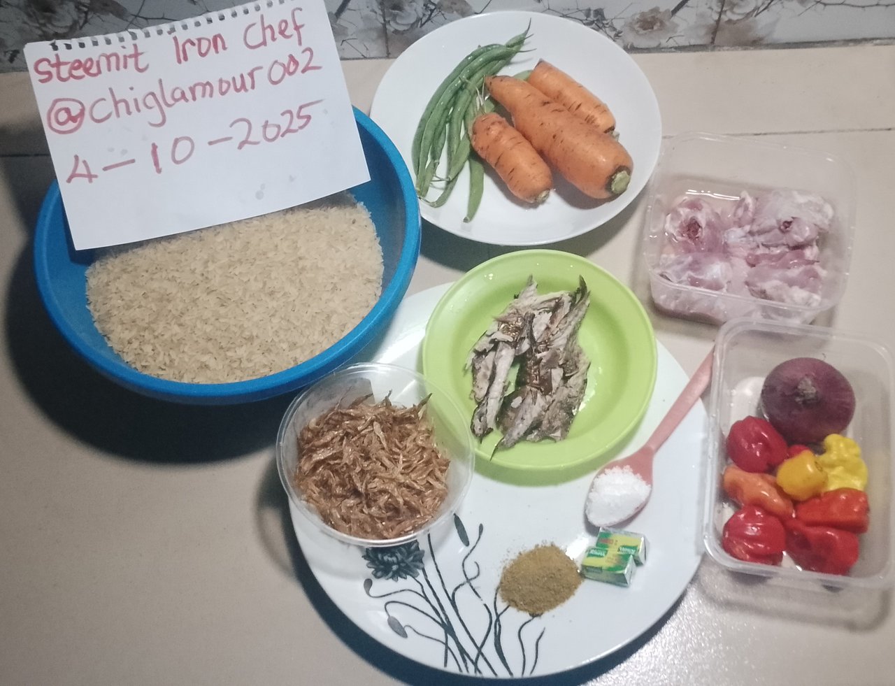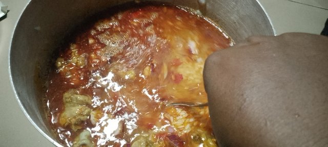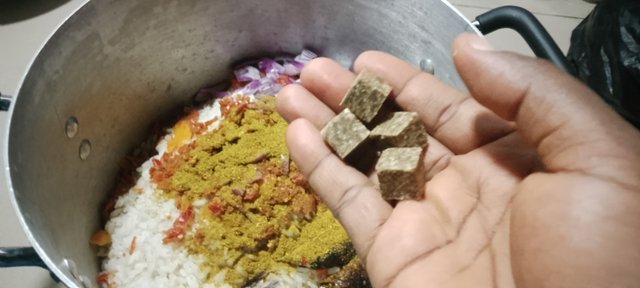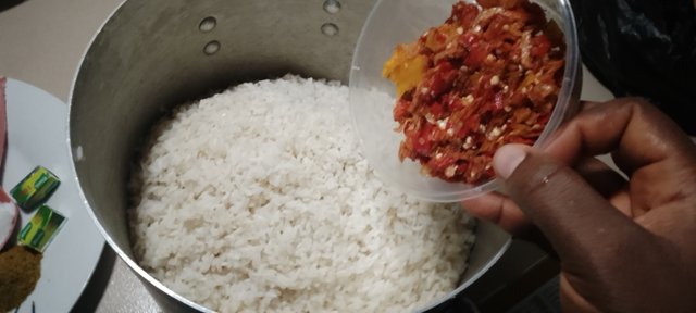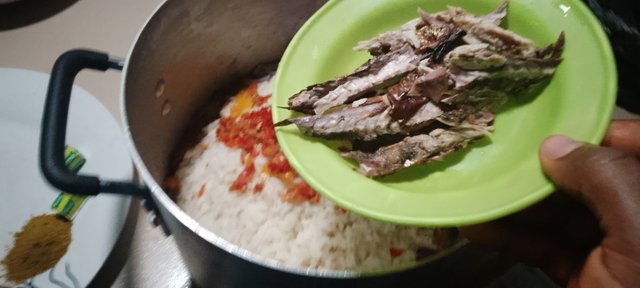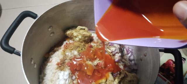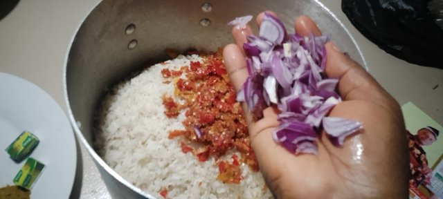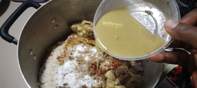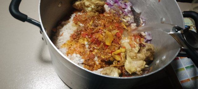 Chop the medium-sized onion and set it aside as well.Once steps 1-3 are done, then proceed to transfer the washed and drained rice into a cooking pot. Then add in the pounded pepper and crayfish, chopped onions, smoked fish, mixed spices, seasoning cubes, salt to taste, cooked and unfried chicken and the chicken stock. Then, add in the palm oil and some water. Give it a quick stir and adjust the taste if necessary.