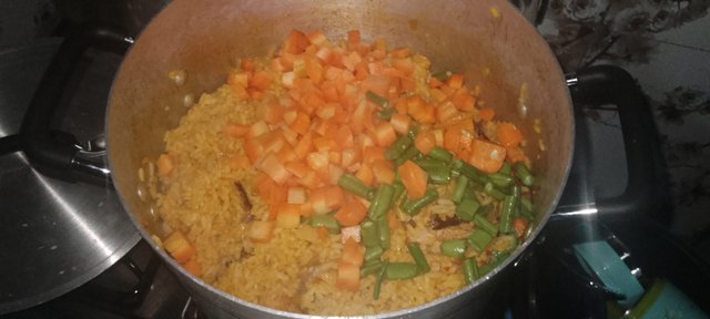 Cover the pot and let it cook.Cook the food for about 25-30 minutes or until the rice is tender. Add in the already chopped carrots and green beans once you turn off the heat. Give it a quick stir to combine the carrots and green beans and leave it covered a bit before serving.