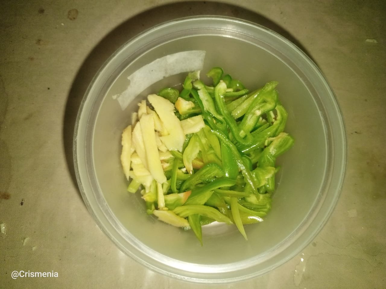 Pasado el tiempo apagué los tomates y los dejé reposar, mientras tanto, corté el jengibre y los ajíes, luego, añadí el aceite en una olla y al calentarse puse a cocinarlos hasta dorarse.