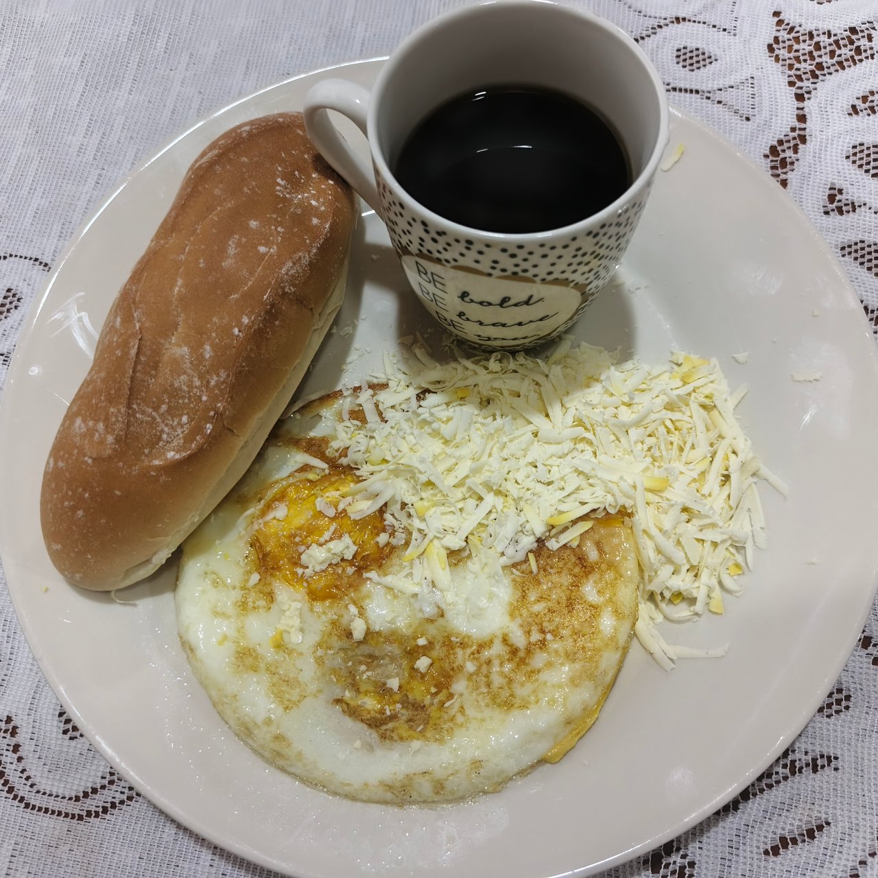 Lunes comienza de una semana y con ello agradeciendo a Dios por siempre proveer nuestros alimentos para hoy como cada mañana el café es lo primero que se realiza en casa es esa bebida infaltable negrito con poco de azúcar que tiende a alegrarme el día luego de ello preparé formalmente el desayuno, el huevo es un excelente proteína para consumir a primera hora ya que es saciante y nos ayuda a tener energía durante el día frite uno para cada uno, acompañé con queso blanco rallado y un pan francés, fue perfecto para agradecer por este primer bocado del día.