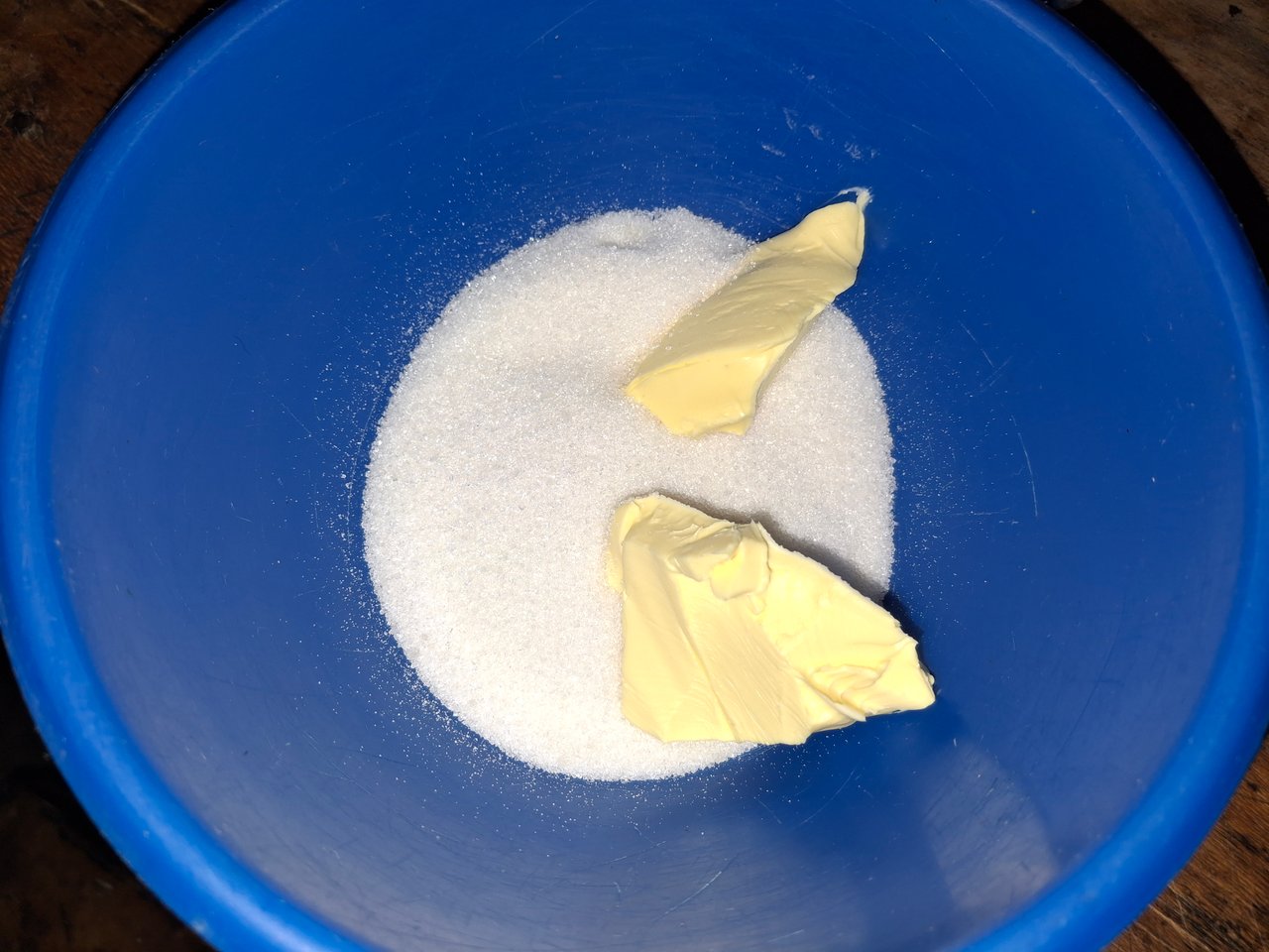 Para esta preparación lo primero que vamos a realizar es colocar la azúcar y la mantequilla.
