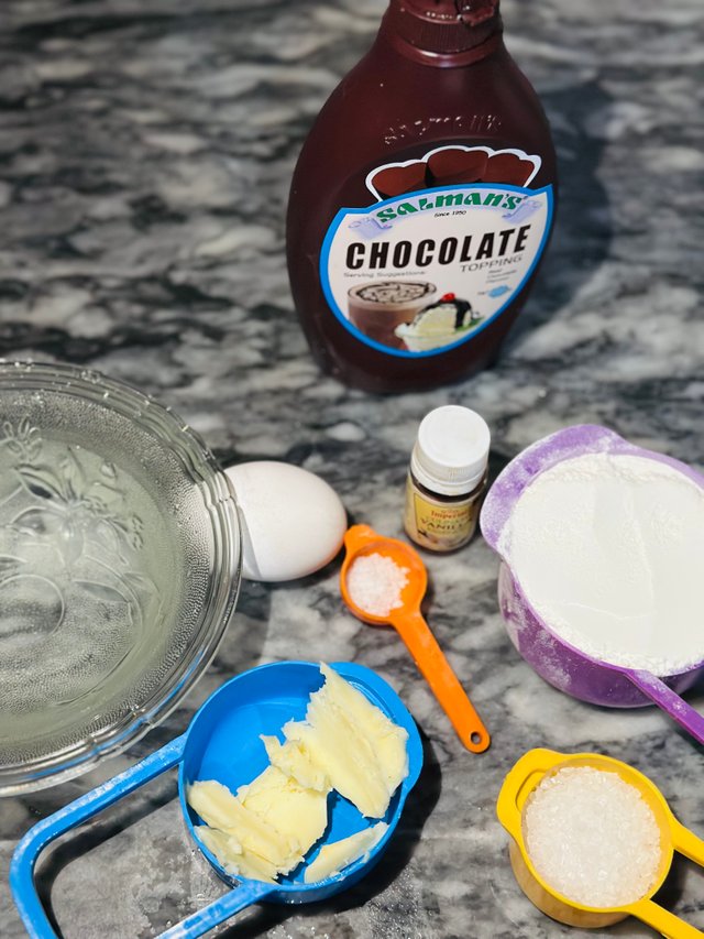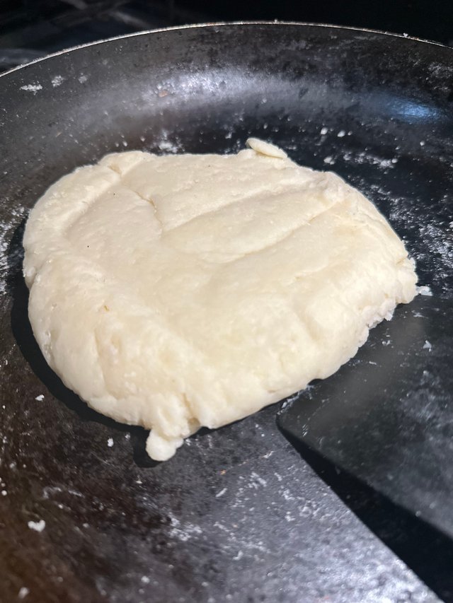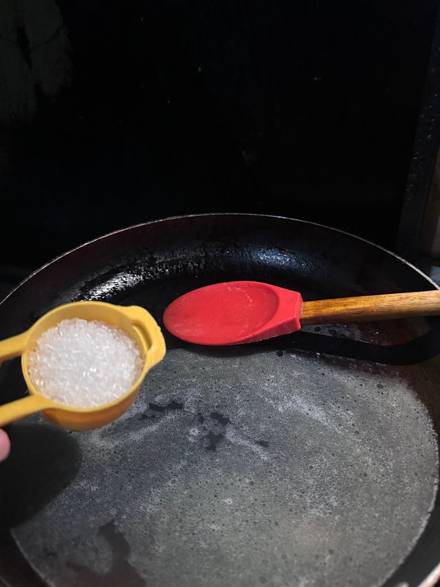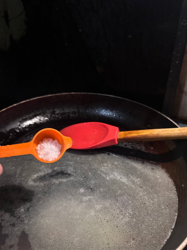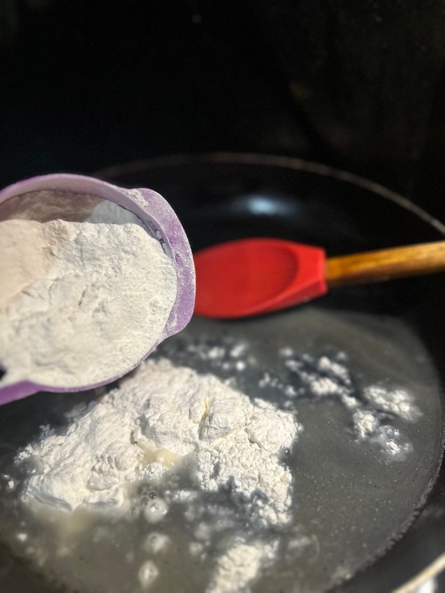 • When the water and butter were mixed and it started to boil, I added two tablespoons of sugar and one teaspoon of salt and mixed it, and then I turned off the stove and immediately poured the cup of flour I had put in it into the water, stirring it gently so that it mixed well.