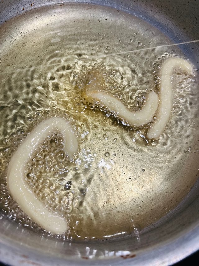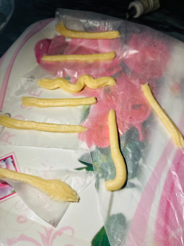 • After that I took one and put all my mixture in it. It was already a little sticky but I carefully covered the sides and slowly poured all the mixture into it and started giving the shape of the churros. This is what I got from the front. I got it in a small size so it was coming out thin but what I saw on the net and what I saw in the contest were thick but because of my pan they were coming out very thin.