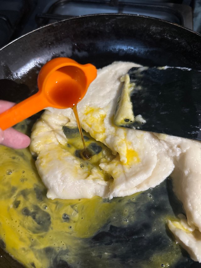 • I then let the eggs cool for five minutes, then broke an egg into it, added a little vanilla essence, and mixed it well.