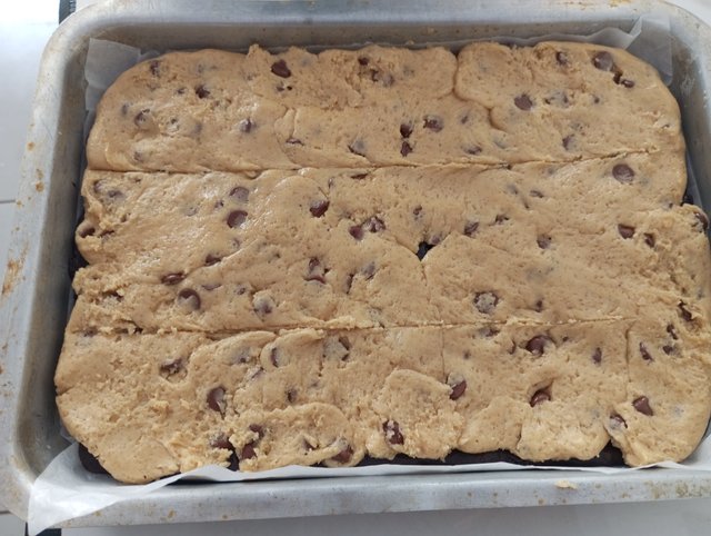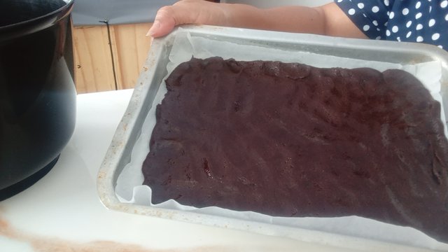Ya teniendo las masas listas procedo a poner papel encerrado en mi bandeja para luego agregar la primera masa que es la brownie, está masa es muy suave pero se puede manejar.