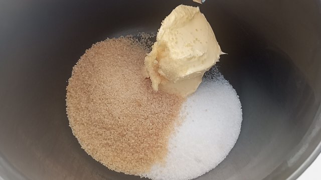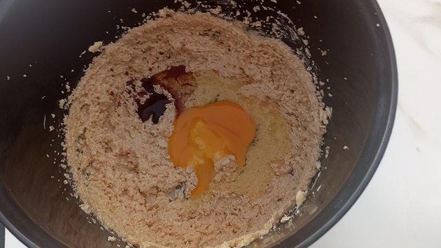 En otro envase colocamos la mantequilla el azúcar morena con el azúcar blanca y lo lleve batidora de mano hasta obtener la crema, luego le agregué el huevo y la vainilla y lo volví a batir otro ratico más.
