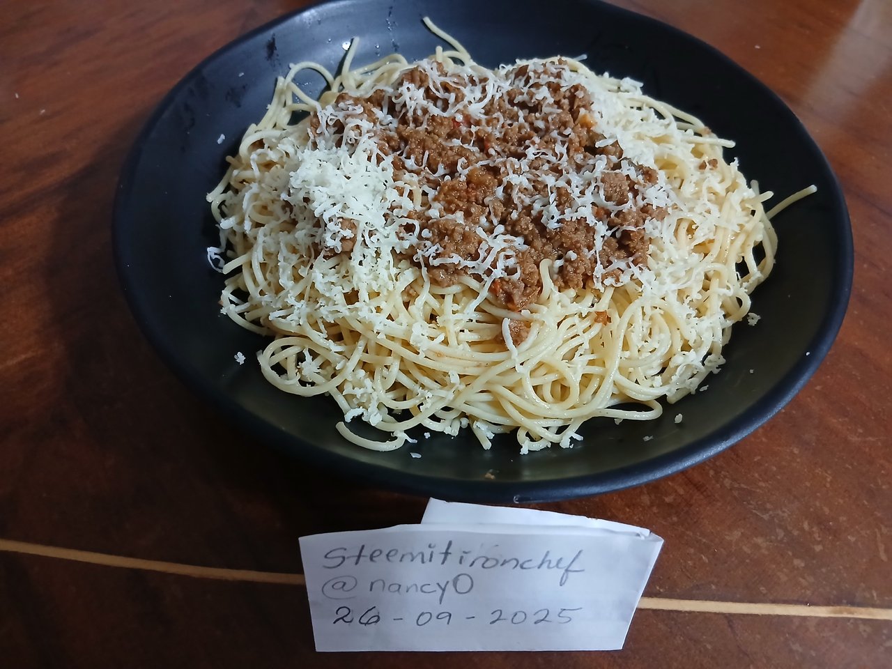 Al medio día me puse a cocinar carne molida corte aliños, sofrei , añadi la carne y la guise prepare pasta larga aldente y le ralle queso, la comida preferida de mis hijos.