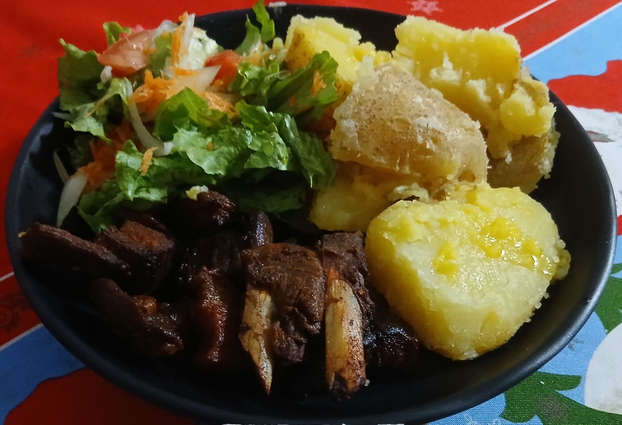 Para el almuerzo tenia pensado cocinar cochino frito, y les cuento que sali a comprar papas porque me gusta combinarlo con las papas bien sea en puré o sancochadas como fue en esta ocasión, tambien prepare ensalada de lechuga, tomate, zanahorea y cebolla con su respectivo aderezo.