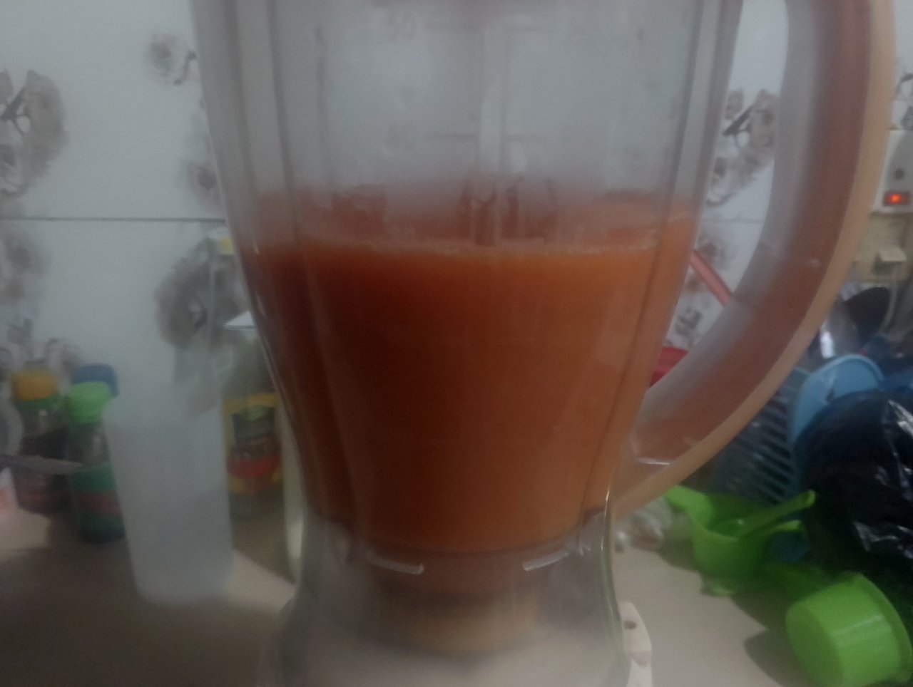 The next is my chopped tomatoes in a clean pot then I added half cup of water into it and put on my low flame to cook for for seven minutes after it has boiled and become soft ,it was ready I removed the pot from the flame and cover to cool , when I checked and it was cool very well I turned it into my tomatoes blender so that it can blend to smooth, it was blended very fine.