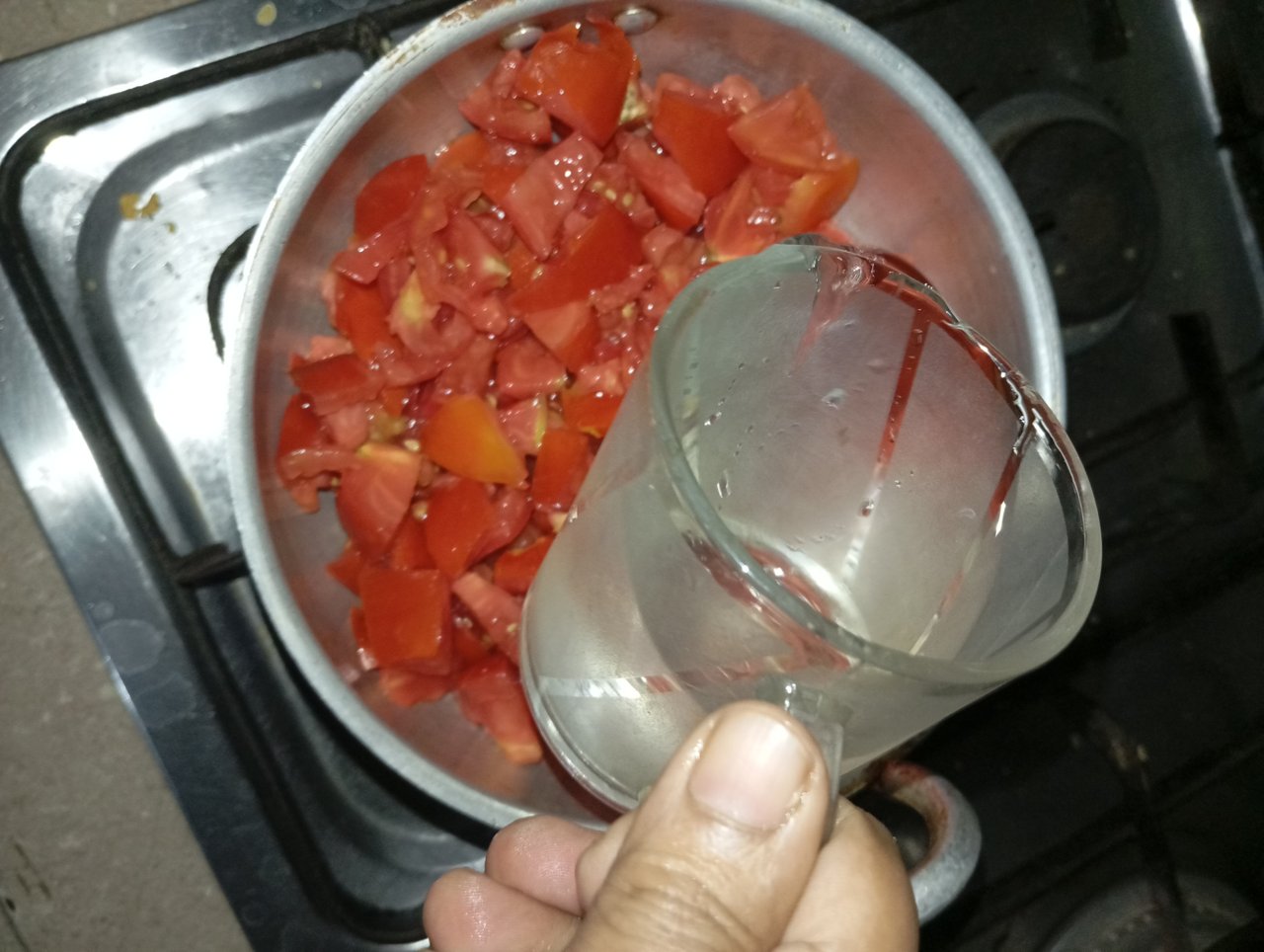 After this, I turned on the flame and now we added tomatoes and half a cup of water to the pan.
