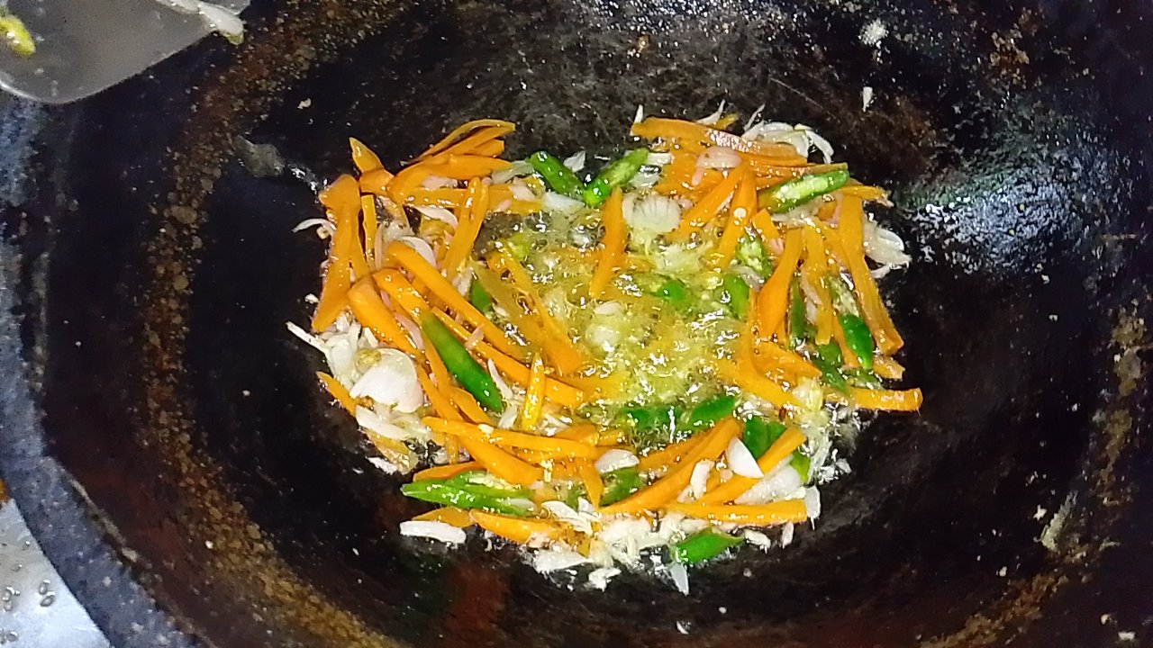 🟨 After frying the eggs well and transferring them to a bowl, I add chopped onions, then chopped carrots, and chopped green chilleis and chopped tomatoo & then fry well for two minutes.