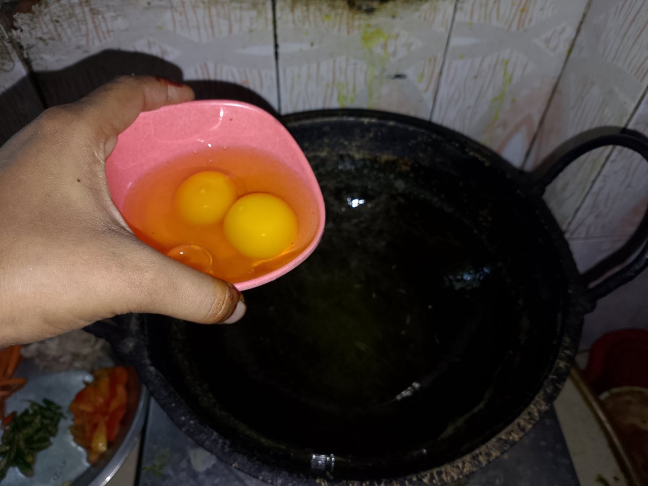 🟨 First, I placed a pot on the stove. After placing the pot, I added an adequate amount of soybean oil to it. When the oil became hot, I added two eggs on it & frying its.