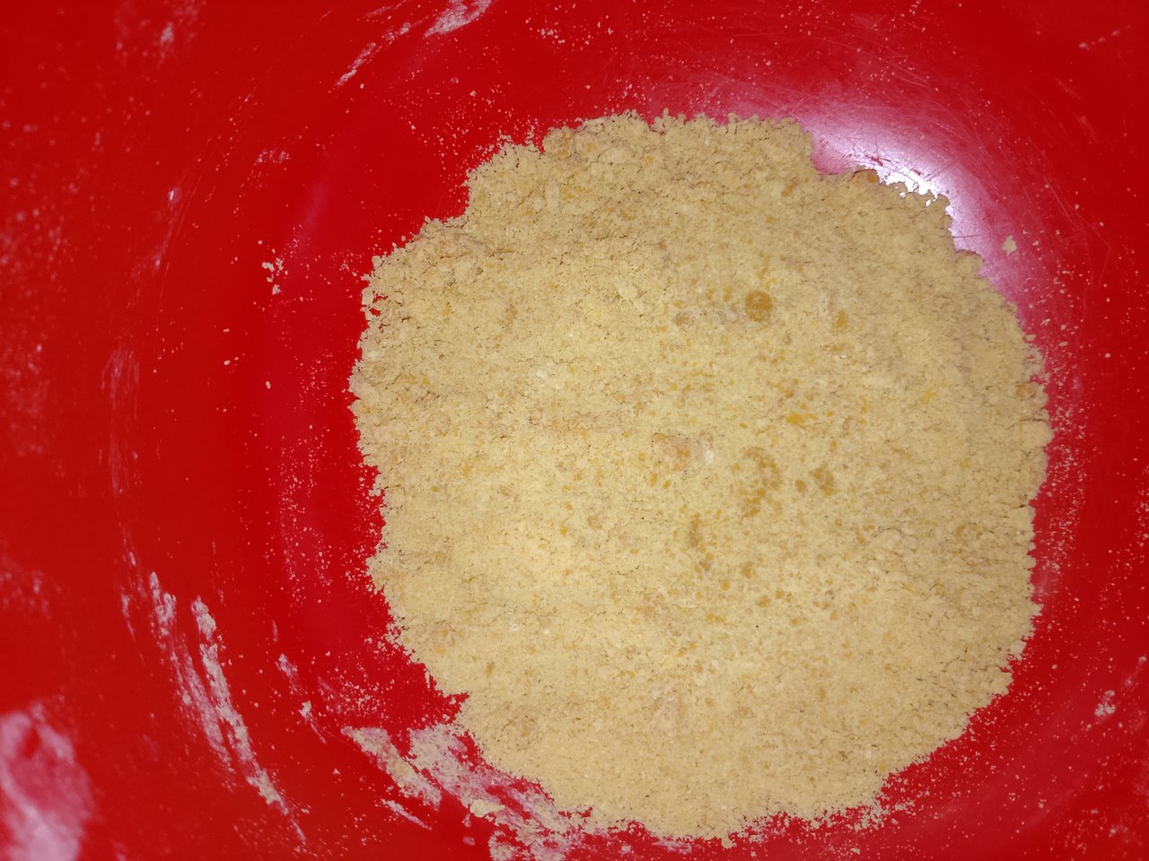 🟫 First, I took a suitable amount of gram flour in a clear bowl. Then, I added two to three spoons of oil and mixed it well. After that, I added two to three spoons of cow's milk and kneaded it thoroughly with my hands to make it crumbly. Then, I placed it in a container.