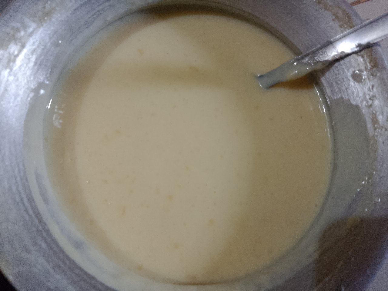 🟧 Next, I took four teaspoons of vanilla custard powder in a clean bowl, dissolved the powder with a little water, and poured it into the milk while continuously stirring.