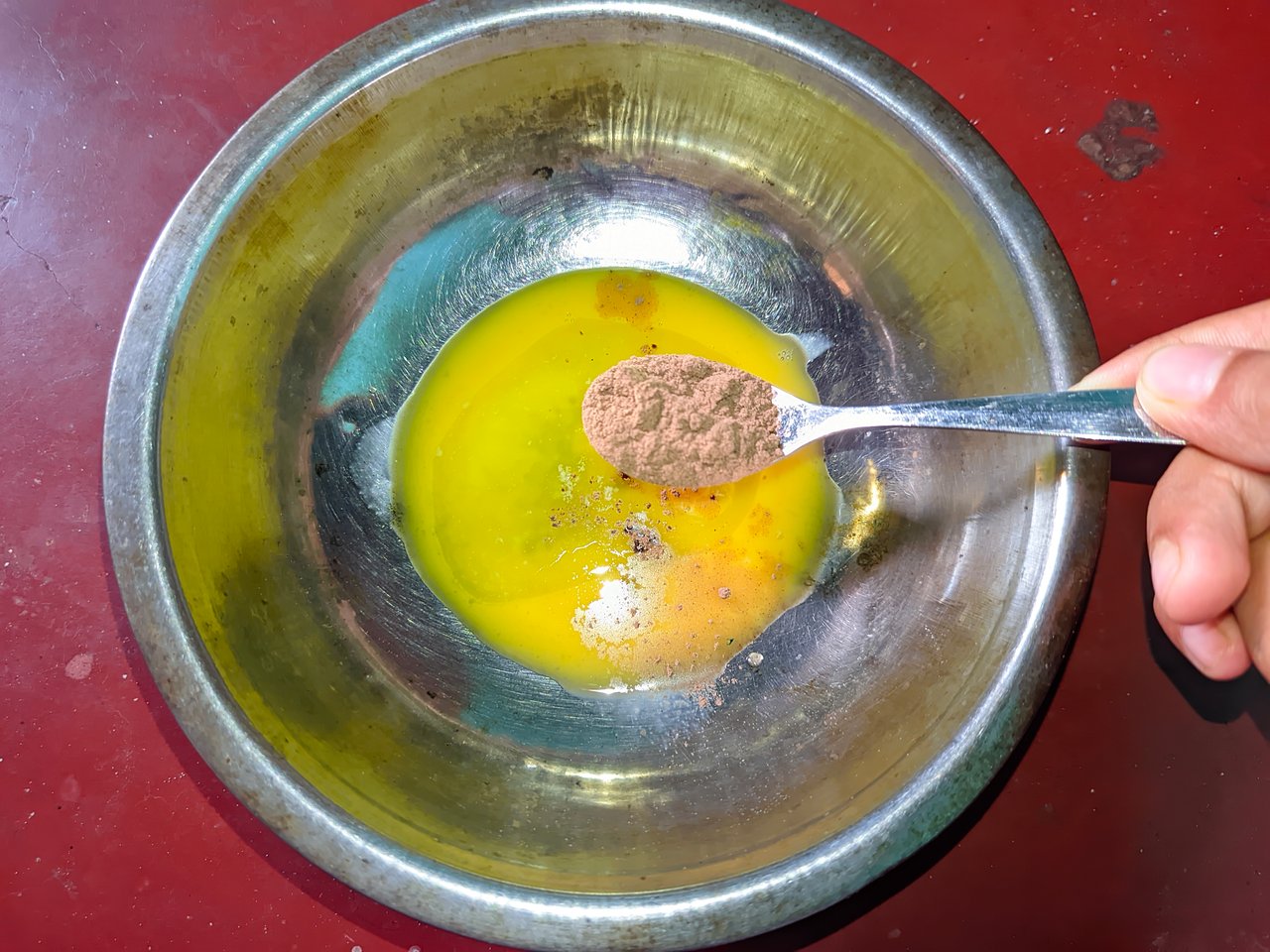 Now, in another clean bowl, mix the melted butter, eggs, sugar, cocoa powder and vanilla essence well until everything is mixed together.