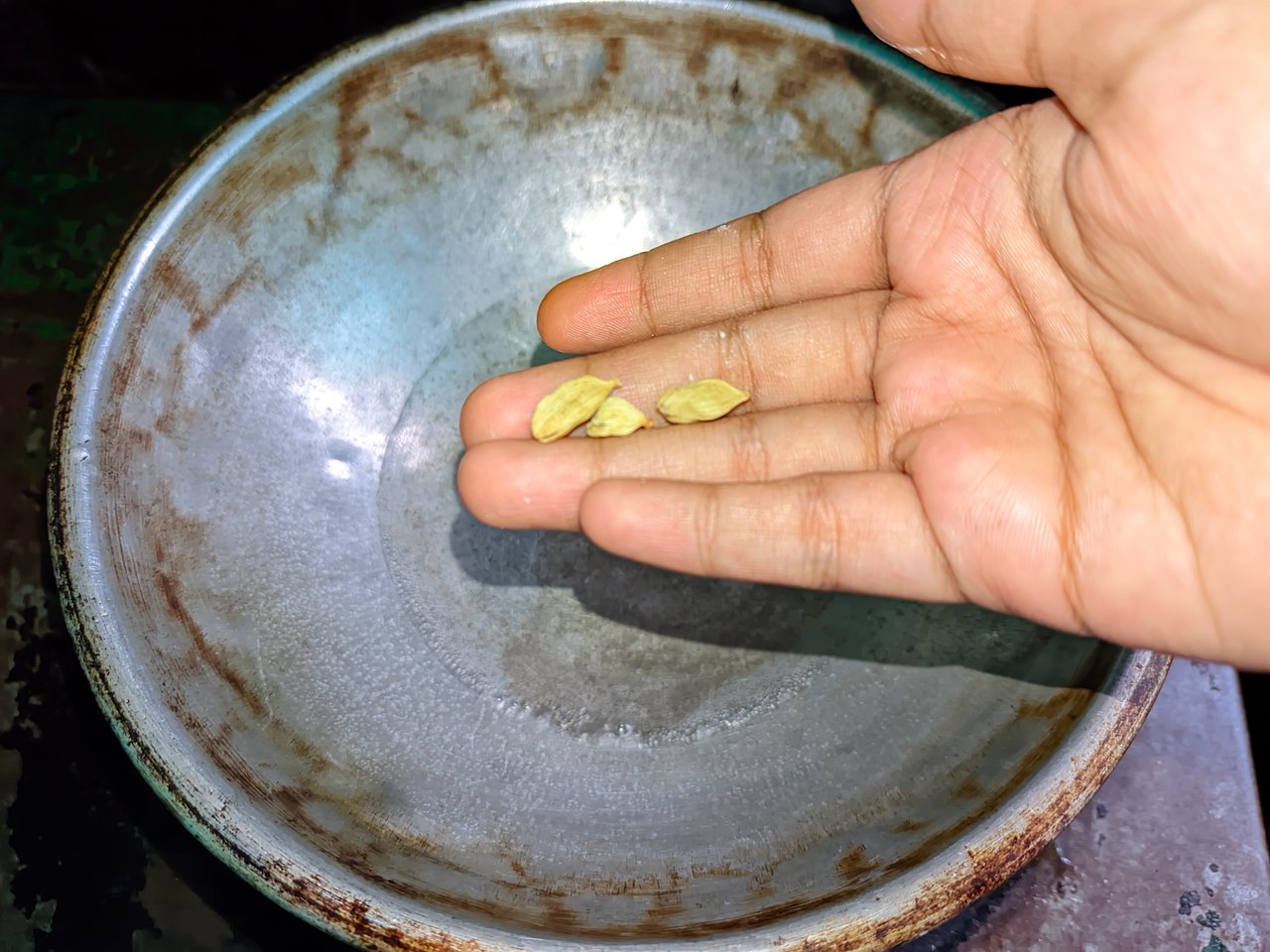 Now I will make the sugar syrup. To make the gram flour syrup, first put a pan on the stove and add 2 cups of sugar and 1 cup of water. Then add 3 cardamoms and a little food colouring to it and keep stirring continuously. To get perfect results, the consistency should be maintained, it will be ready in 5-6 minutes. After 5-6 minutes I took some syrup on my finger and tested whether it was sticky and a thread was formed between the two fingers. If a thread was formed between the two fingers then it was ready.