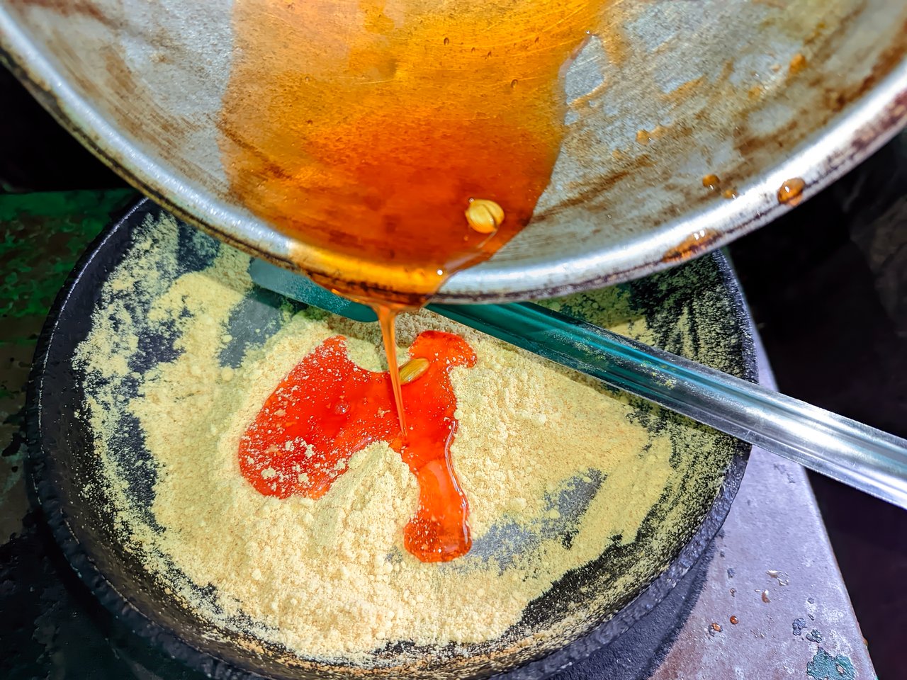 Now put a pan on the stove and add the strained gram flour in it and fry it well. Fry it till the gram flour turns yellow to golden in colour, the gram flour will be fried in about 4-5 minutes. Then remove it from the stove.