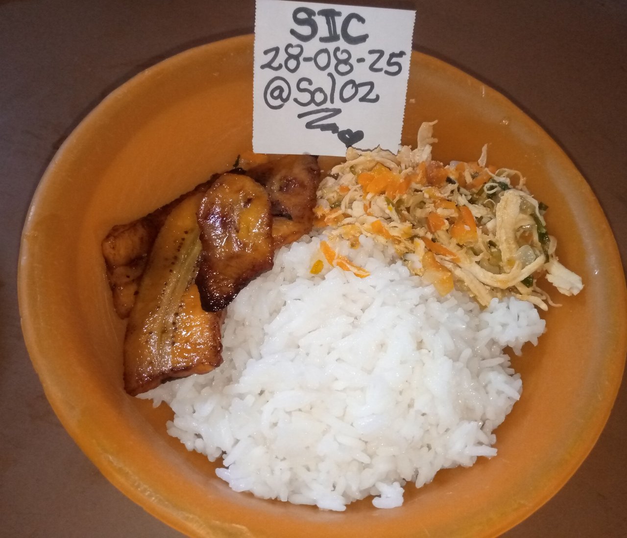 Ya pasado medio día almorzamos arroz blanco, con pechuga desmenuzada bien aliñada con cebolla, zanahoria rallada, cilantro, ají, cebollín, ajo, con nuestro contorno favorito tajadas de plátano maduro.