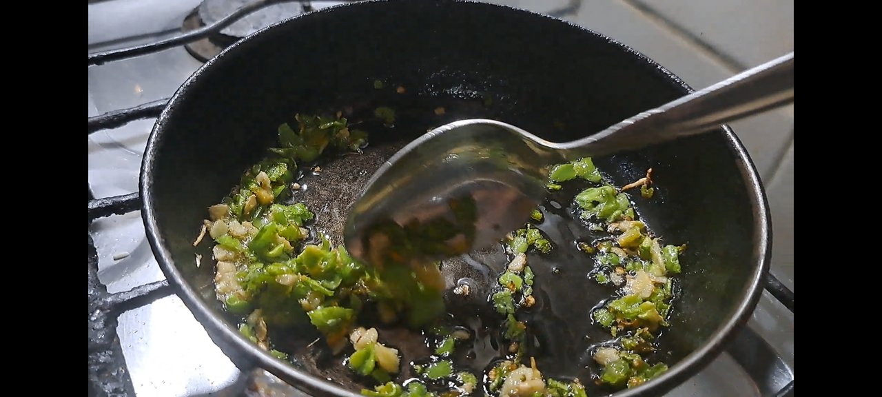 Seguidamente, lleve un sartén a la hornilla para calentar, vertí las dos cucharadas de aceite y una vez caliente añadí el jengibre y los ají verdes a sofreír hasta que se doraran, retire del fuego y reserve.