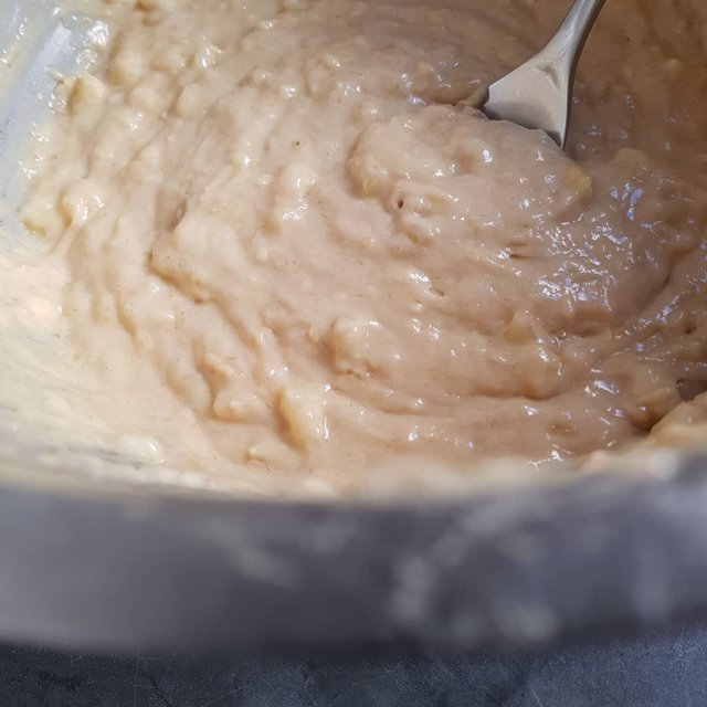 What you need: 3 over ripe bananas, 1 1/2 cups of sifted all-purpose flour, 1/3 cup of melted butter, 1 teaspoon of baking soda, A pinch of salt, A heaped tablespoon of melted / softened peanut butter, 1 teaspoon vanilla extract, 1/2 cup of sugar if you would like it less sweet, 1 full cup if you like it sweeter, 1 large egg
