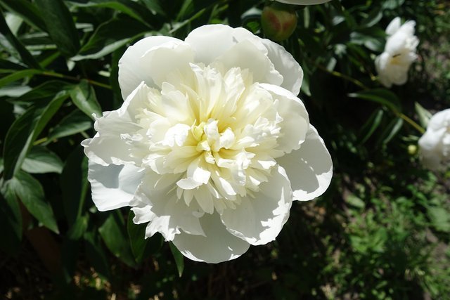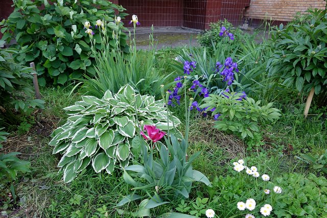 Этот цветник я увидела во время прогулки в обеденный перерыв. Я фотографировала пионы около обычной девятиэтажки.